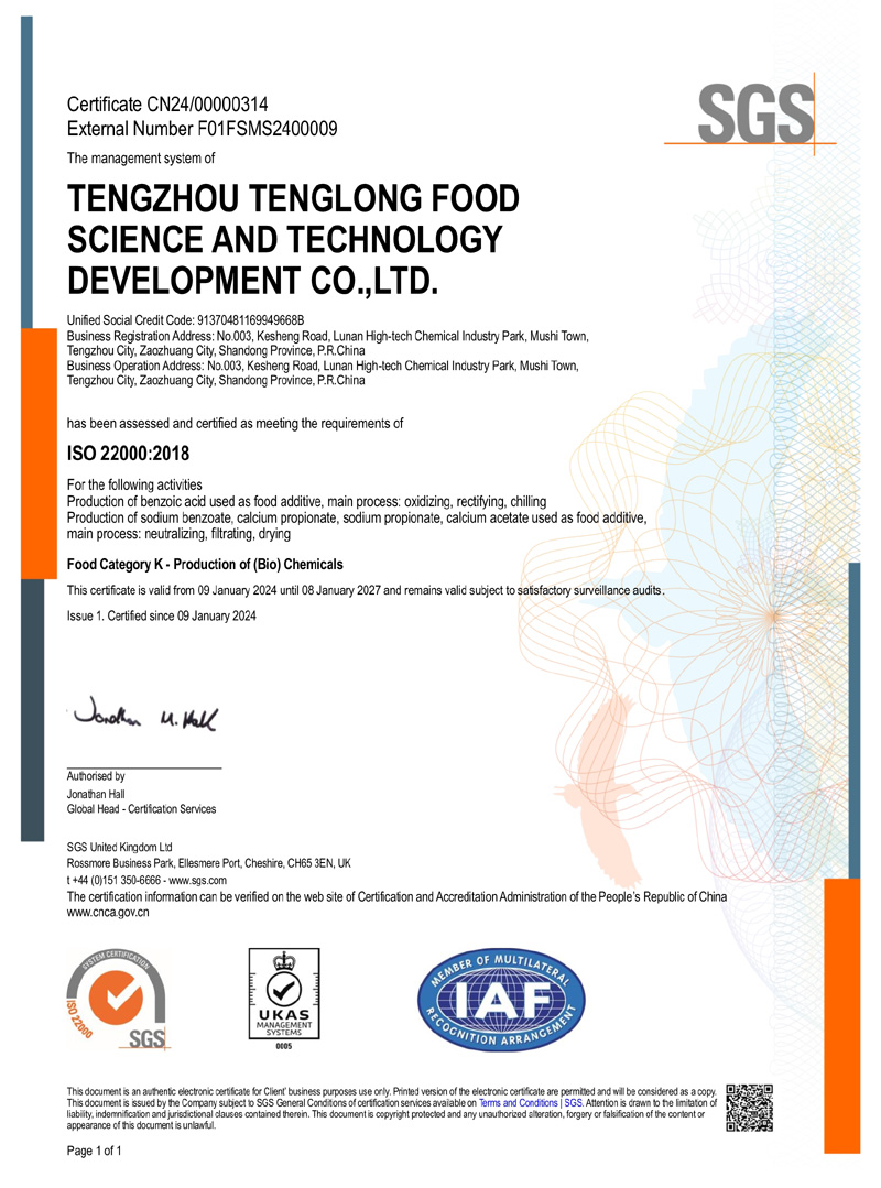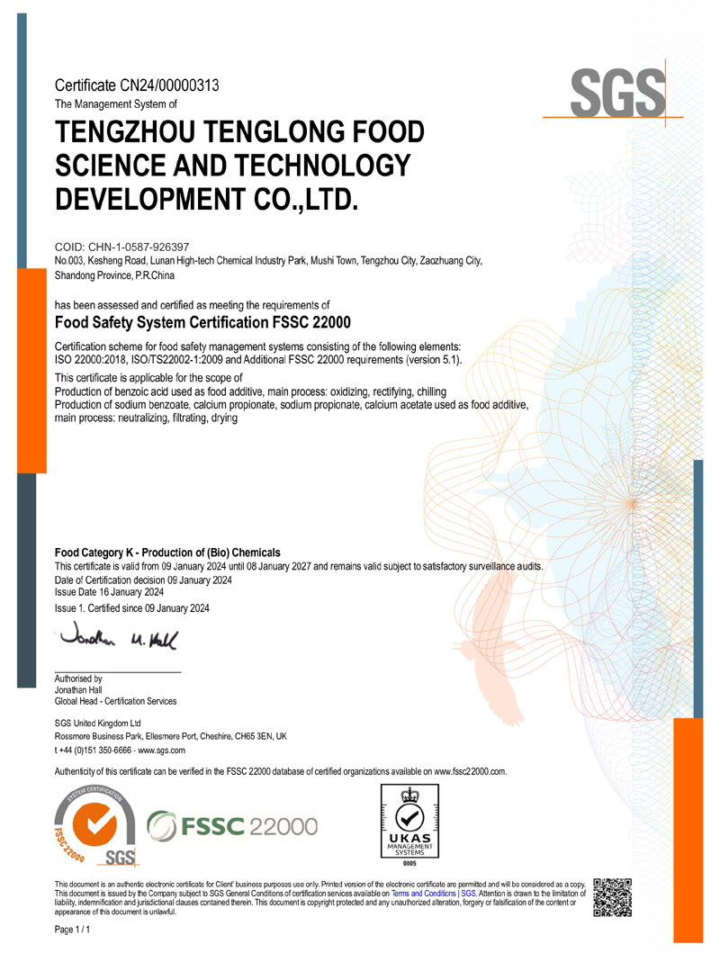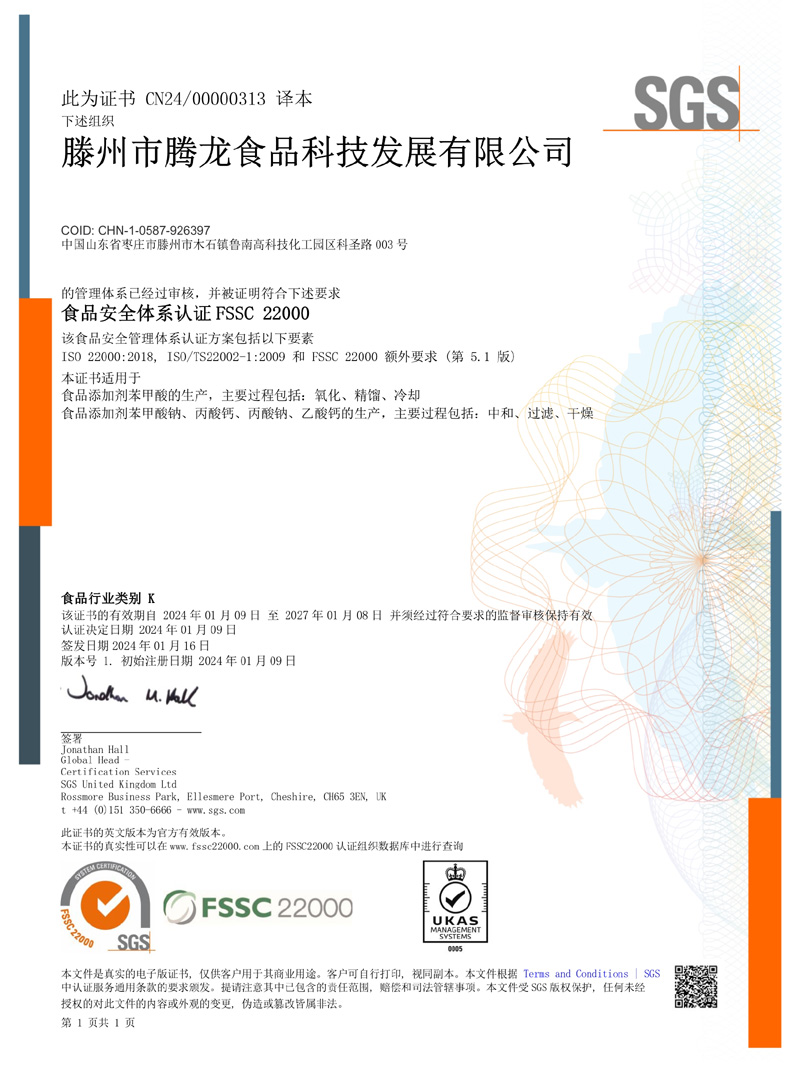 滕州市騰龍食品科技發(fā)展有限公司坐落在山東省滕州市木石鎮(zhèn)魯南高科技化工園區(qū),成立于1996年,前身是滕州市騰龍化工有限責任公司,公司專業(yè)生產(chǎn) 苯甲酸,苯甲酸鈉,丙酸鈣,丙酸鈉和醋酸鈣等系列產(chǎn)品。